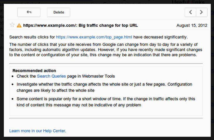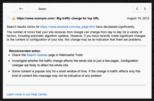 検索結果での表示やクリック数が著しく上昇した場合、または反対に著しく下降した場合にそのことを伝える警告メッセージがグーグルウェブマスターツールに届くようになった。