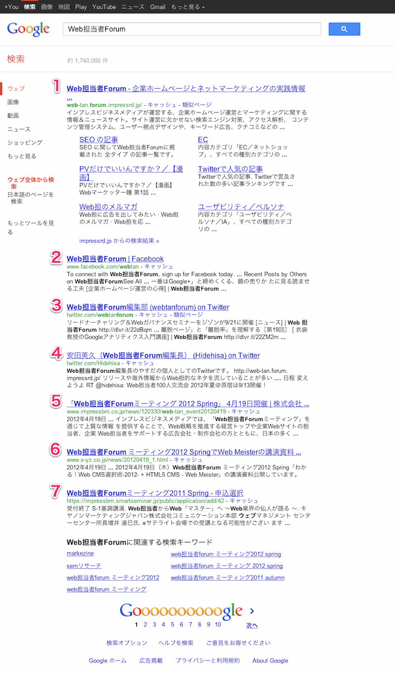 サイトリンクが出ているときのグーグルの検索結果が1ページ7件表示になったようだ。