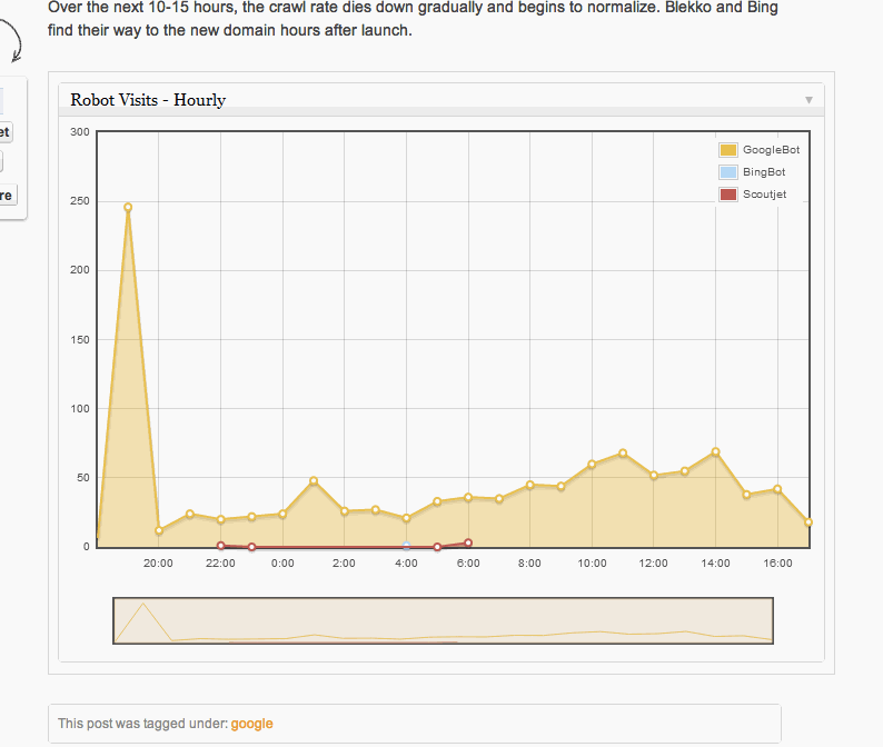 ドメイン名を変更してアドレスの変更ツールから通知すると、その直後にGooglebotの旧ドメイン名のサイトへのアクセスが一気に増加し、程なくして元の水準に戻った。アドレスの変更ツール実行後、わずか25秒位内にはクロールが増え始めたそうだ。ちなみにBingのクローラのアクセスに特別な変化は見られなかった。