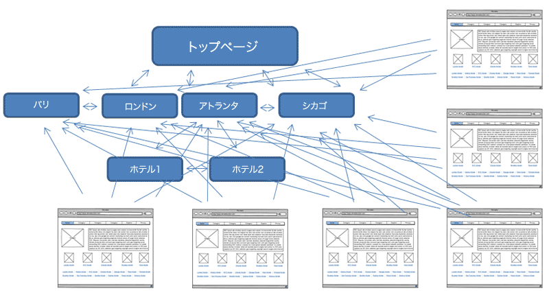 こういったサイトの規模をさらに大きくすると、サイト間のリンク構成(そして、マイクロサイトの例の中にあるリンクは、すべてサイトワイドリンクだ)は、次のような形になってくる。