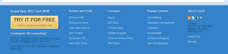 SEOmozで使っているようなフッタリンクはよくできている。ウェブサイト内の最も重要かつ有益なページに誘導してくれるからだ。SEOmozのフッタは次のようになっている。
