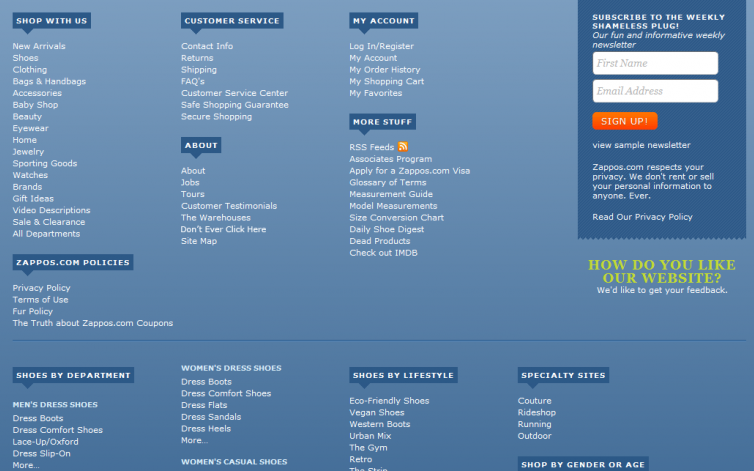 Zapposでも同じようなことをしているが、面白いことに、トップページでは各カテゴリページとは違うフッタを使っている(トップページのフッタとここに掲載したカテゴリページのフッタを見て違いを調べてほしい)。アンカーテキストを詰め込んだり、関連性の薄いページへのリンクを全ページに置いたりはしていない。メインのフッタは、確かに巨大だけれど、ユーザーにとって有益なリンクが含まれている。