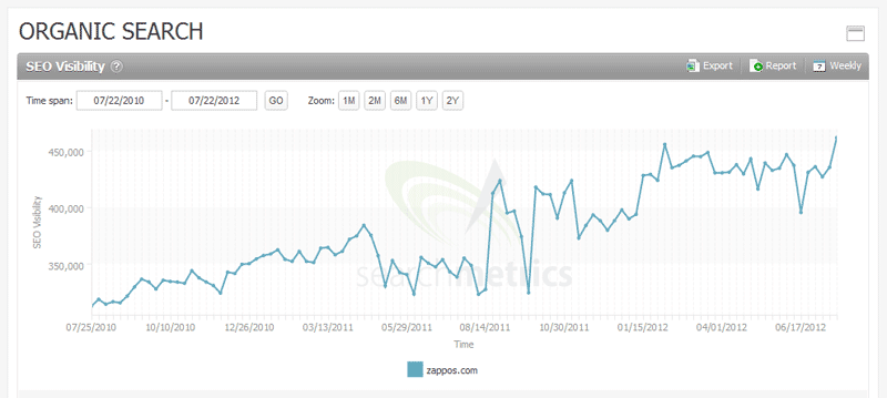 Zapposが検索結果ページに登場する回数は右肩上がりに増えている。以下に、SearchMetricsのツールを使って調べた結果を紹介しよう。