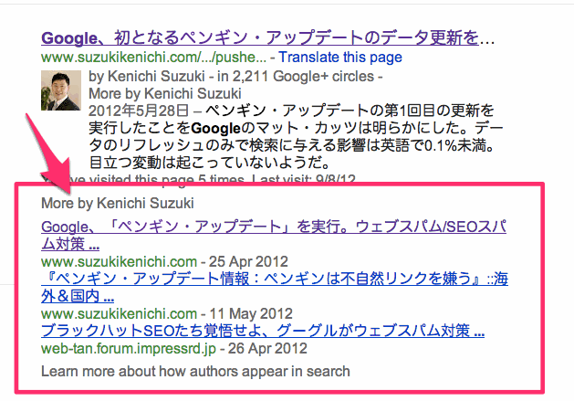 グーグルによれば、その著者によるコンテンツをユーザーがもっと見たいだろうと判断したら、ユーザーが検索結果に戻ったときにその著者による他のページを見せるとのことである。