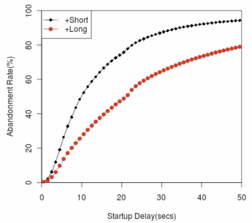 再生開始までの時間が2秒を超えるあたりから再生をあきらめ始め、その時間が1秒増えるごとにあきらめる率が5.8%増えています。 -