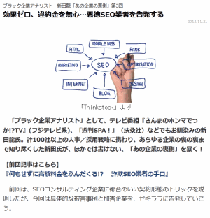 悪質なSEO業者の実態を3例、わかりやすく説明しながら問題を指摘した記事。読んでいるだけで血圧が上がってしまいそうなSEOがらみの事例として、