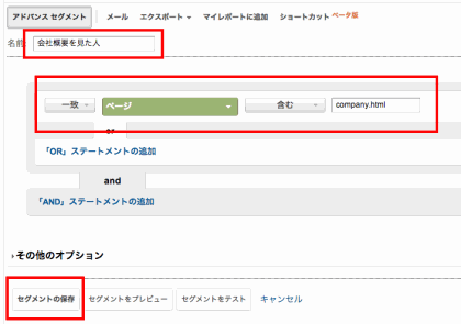 たとえば、会社概要ページを読んだ人に絞り込む場合は、新しいカスタムセグメントを作って、以下のように設定します。