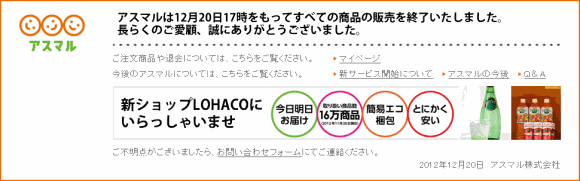 12月20日に販売を終了し、来年1月21日にサイト「アスマル」を閉鎖する。ロハコへの会員データの引き継ぎやポイントの移行などは行わない。そのためアスマルでは既存会員に12月20日までにポイントを消費することを勧めている。