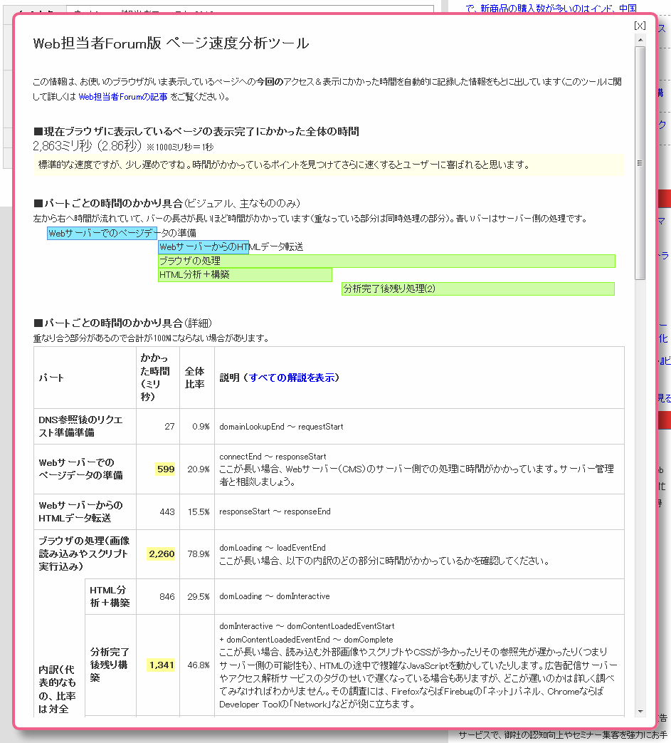 その後、表示速度が遅い原因を調べたいページをブラウザ表示した状態でこのブックマークレットを実行すると、そのページ内に、次のような速度分析が表示され、ページ表示のどの部分にどれぐらい時間がかかっているかが一目でわかります。