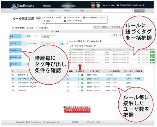 その他、階層ごとにタグ設定のルールを確認したり、接触したユーザー数を把握したりするなど、タグマネジメントとして必要なことはもちろんできます。スマートフォンやタブレット端末にも対応しています。