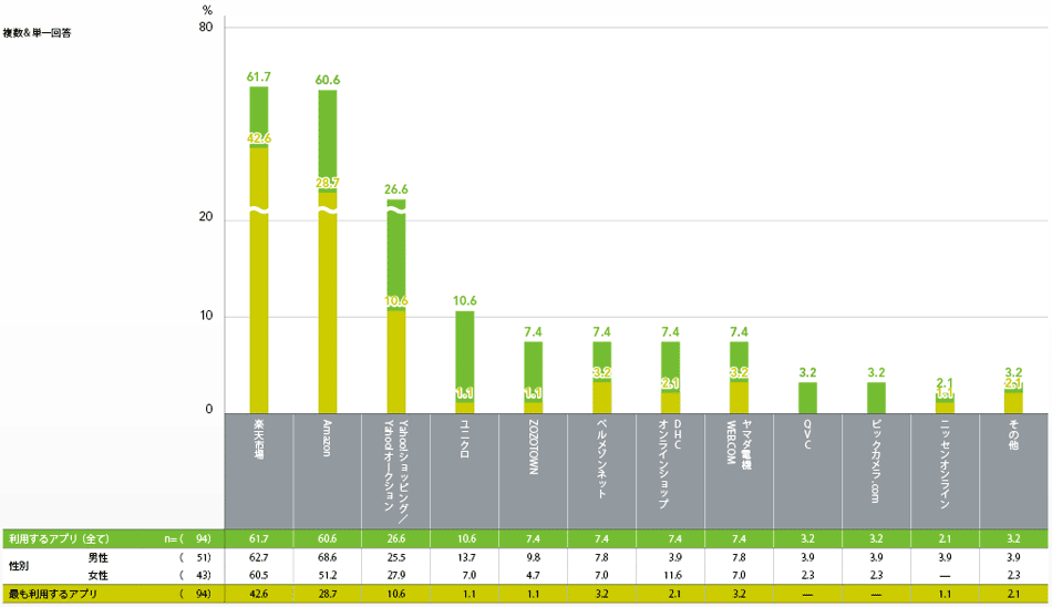 具体的に利用しているECサイトについては、8割近くのユーザーが「楽天市場」と「Amazon」を利用しており、他のサイトと比較しても突出している。その傾向はECアプリについても同じで、この2サービスの人気が非常に高いことが分かる。それを除くと、服飾系と家電系のサービスが続いているが、主に女性に利用されている服飾系サービスの方がやや高い利用傾向を示している(図6、図7)。