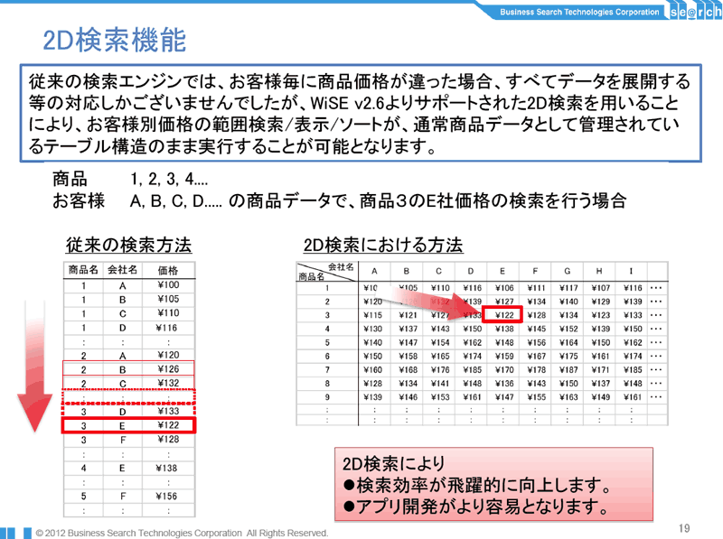 この2D検索を実装することで、従来は難しかった「顧客×価格」による顧客ごとの価格出し分けや、「サイズ×在庫」によるSKU単位での在庫状況の表示が容易に実現できるようになる。