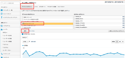 いろいろ方法はあるのだけど、今回はアドバンスセグメントで「モバイルトラフィック」にチェックを入れてみよう。スマホだけではなくiPadなどのタブレットも入ってしまうが、大筋の傾向がつかめる。
