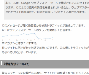 実際に、このメッセージが来たサイトでは、作った覚えのないページ(警告文のなかに具体的なURLが示されていた)があった。メッセージのとおり、ハッキングの被害にあっていたようだ。また、このメッセージの少し前から検索トラフィックが激減していたとのことだ。