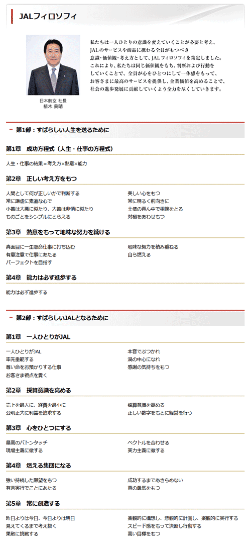 またJALフィロソフィも刷新しました。JALフィロソフィとは、JALに関わるすべての者が持つべき価値観や考え方を40項目にまとめたもので、全社員が手帳サイズの冊子を持っています。フィロソフィ教育が年に4回あり、役員は月1回のリーダー研修を行っています。