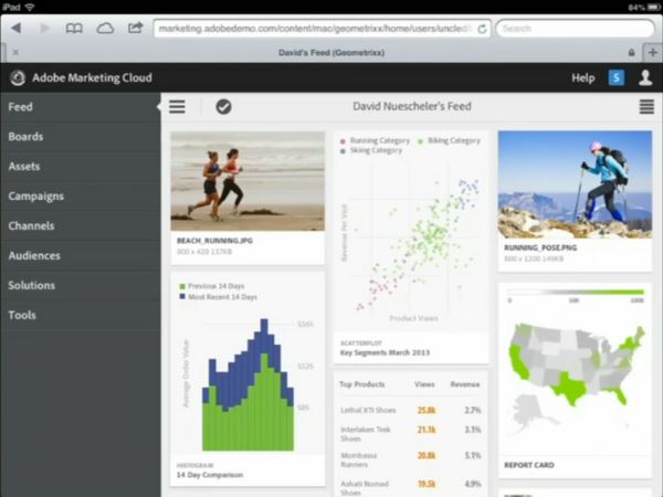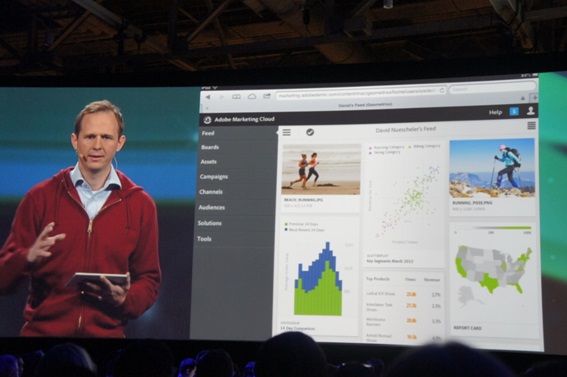 基調講演の前半の記事で説明したように「Adobe Marketing Cloud」として統合された製品群には、シングルサインオンでアクセスでき、ログインするとまず表示されるダッシュボードには、あらゆるデータ・コンテンツ・情報がフィードされ、マーケティング施策の全体像がこのプラットフォーム把握できるようになっている。