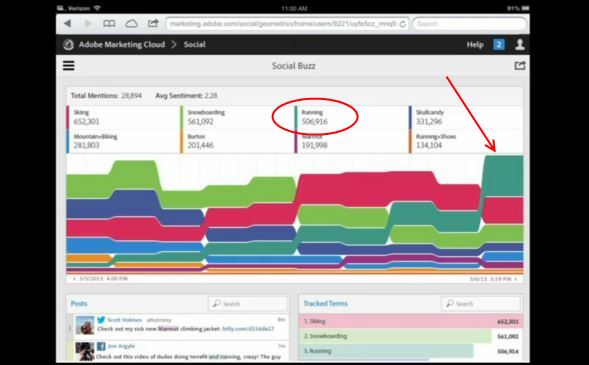 ウィリグ氏は「Adobe Social」のレポートを確認し、TwitterやFacebookで何が話題に上っているのかをチェックし、今回デモのストーリーの対象である「ランニング」の話題が急増していることを把握した。さらに、YouTubeで「テラフィット」に関する動画がよく観られ、コメントも活発に投稿されていることもわかった。