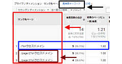 プライマリディメンションは、デフォルトでは「リンク先ページ」(図2赤枠部分)が選択されており、このサイト内検索の結果ページのURL(図2青枠部分)が表示されている。