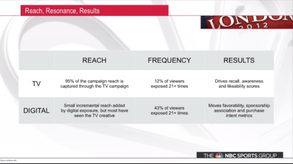 リーチはテレビが依然として大半と圧倒的だが、デジタルはまた別の特徴をもっているのだという。それは、21回以上のフリークエンシーがあった閲覧者の比率が非常に高かったということだ。
