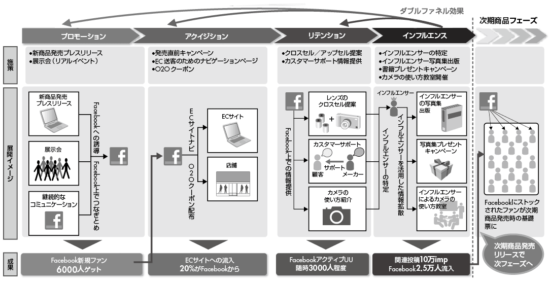 その結果、Faceboookページ上のアクティブなユニークユーザー(UU)数は一日平均3000人と高い数値を叩き出し、新しいレンズやグッズのクロスセル、さらに性能の高い機種へのアップセル、次期シリーズの商品発売時の顧客基盤づくりなどに貢献した。