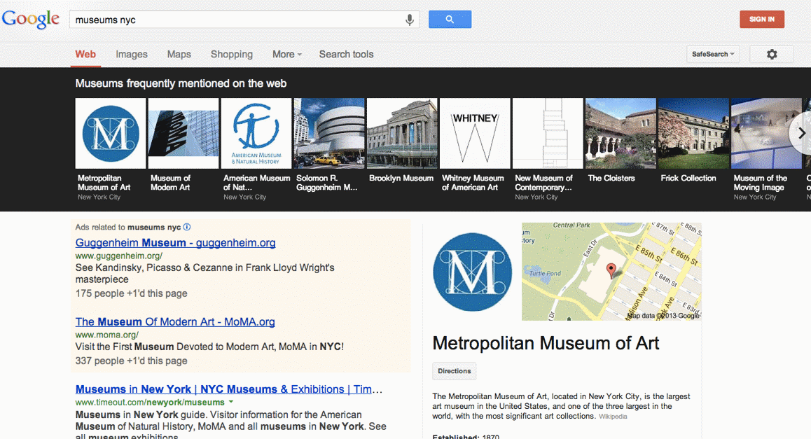 - ナレッジグラフには、最も関連性の高い結果に関する情報が、ロゴ・地図とともに表示される。
