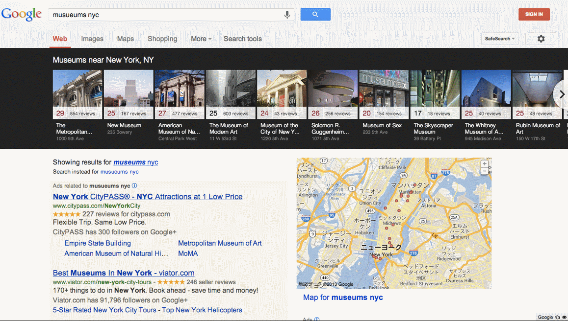- 検索結果の右側にはナレッジグラフのパネルではなく検索クエリに関するグーグルマップの地図結果が表示される。