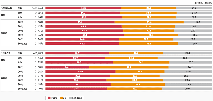 10月、11月における調査では、2ヶ月連続でau、SoftBankに購入者数で及ばない結果を示したドコモだったが、12月購入者数においては全体の約45%を確保し、ほぼ全世代において最多シェアを記録している。2013年1月では他キャリアにやや詰められるも最多シェアを維持するなど、結果的には2012年冬モデル発売効果が感じられる結果となっている(図1)。