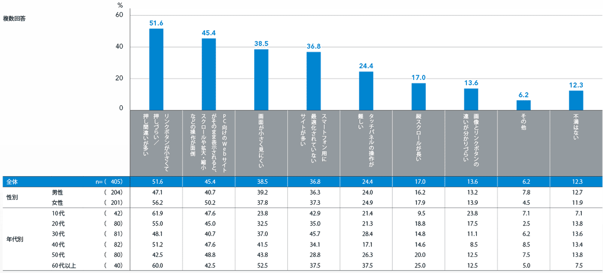 また、女性においてはこの「画面の小ささ」に対する不満は更に増えており、加えて「リンクボタンが小さくて押しづらい」という不満が男性以上に多いのも特徴となっている。ネイルファッションを楽しむユーザーが多いことなどもその要因と思われるが、全体的に不満が減少したとはいえ、不満要素は年代、性別毎に特徴的に出現しているのも事実である。対象とするユーザー層に合わせた不満改善は、サービス内容の向上と併せて、きめ細やかに実施していくことが引き続き重要であるといえるだろう。