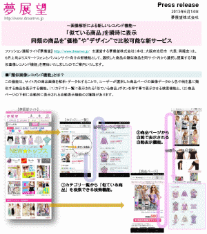 夢展望(本社大阪府、岡隆宏社長)は6月14日、色や柄が似ているアパレル商品を提案する機能を導入した。類似した商品の画像を表示させることで、目的の商品を探しやすくするとともに、さまざまな商品を提案できるようにした。
