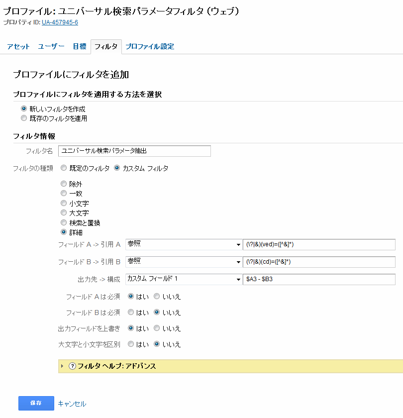 次に、アドバンスフィルタを2つ設定する必要がある。Googleのリファラ文字列から「ved」と「cd」を抜き出すもの(ユニバーサル検索パラメータ抽出)と、Googleアナリティクス内でそのデータを表示するためのもの(ユニバーサル検索パラメータ表示)だ。