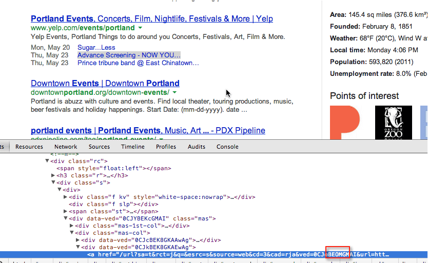 グーグルの検索結果ページをスクレイピングできれば、検索結果ページにどういった「ved」要素があり、それぞれがどういう検索の種類を示しているのかを判断できる。この場合、「href」はJavaScriptの中にある。これを引き出す最も簡単な方法は、PhantomJSなどのヘッドレスブラウザの利用だ。
