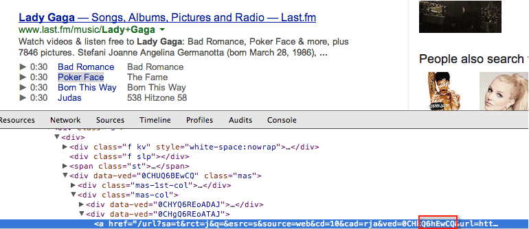 音楽のリッチスニペットならば、「ved」パラメータには「Q6hEw」という文字列が入っている。