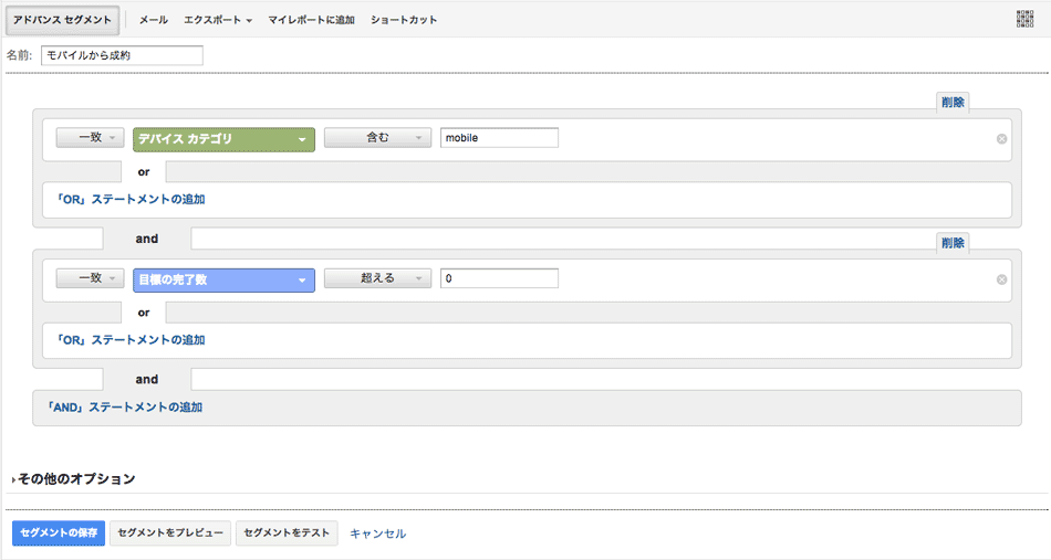 うん、だいたい傾向がつかめたね。次に、もう少し細かく見てみよう。新しくカスタムセグメントを作って、PCとモバイルトラフィック、それぞれから成約した人を見てみよう。