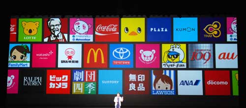 LINEの法人向けソリューションでは、企業がユーザーと直接コミュニケーションできる「公式アカウント」、独自スタンプの「スポンサードスタンプ」、飲食店などのローカルビジネス向けの「LINE@」などを展開。公式アカウントの採用企業は1年で100社を突破し、LINE@はリリースから8か月で1万1,000の店舗や企業が参画している。