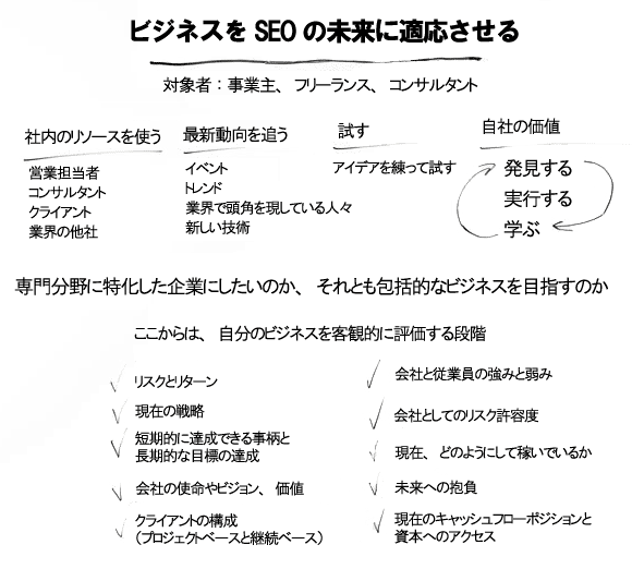 そこで今回のために用意してきたのが、「SEO業者や事業主がやるべきことのリスト」だ。このチェックリストを使って自社のビジネスを詳しく見直し、