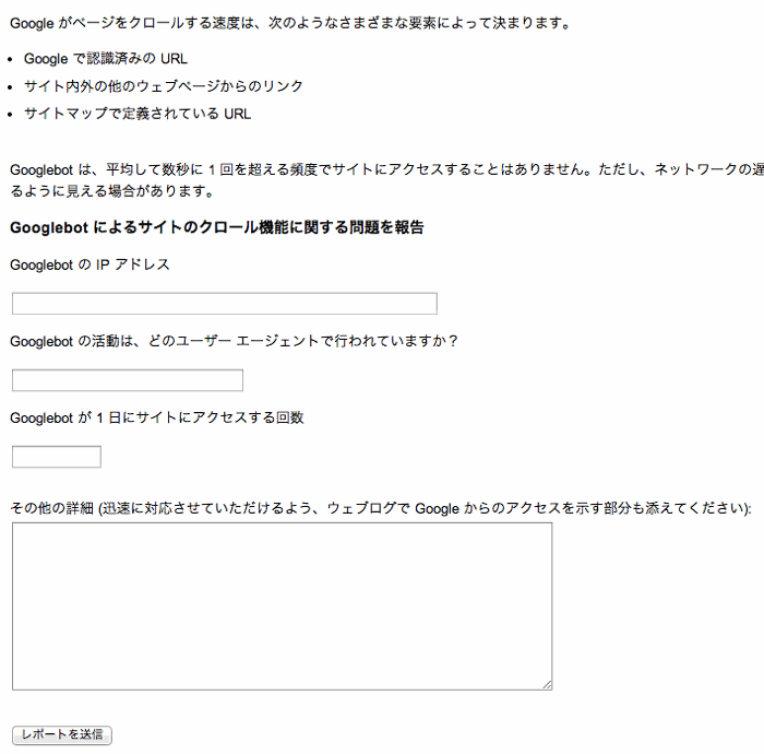 右上の歯車アイコンから[サイトの設定]>[クロール速度]セクションの右にある「詳細」をクリックすると出てくる「Googlebotに関する問題を報告」をクリックする。するとフォームが表示され、詳細を報告できる。