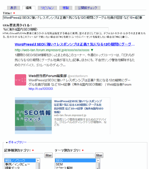 これは公開前の自動チェックとは違うのですが、そのコンテンツがグーグルの検索結果やソーシャルメディアでどんな風に表示されるのかをイメージできるプレビュー機能を記事編集画面に付けています。
