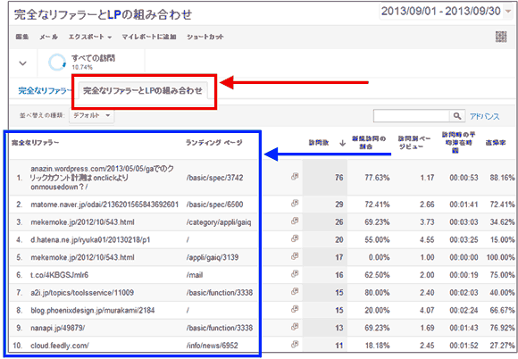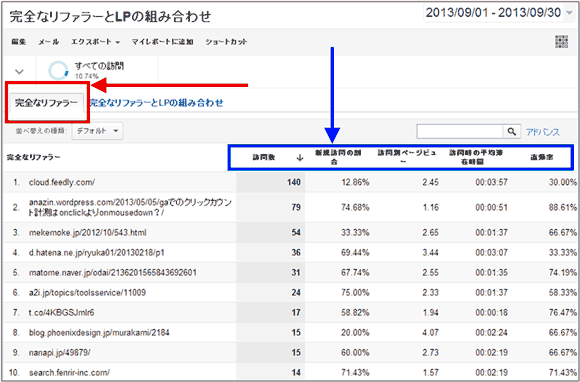 もう1つの「完全なリファラーとLPの組み合わせ」タブ(図9)は、「完全なリファラー」と「ランディングページ」を組み合わせて表示するレポートだ。