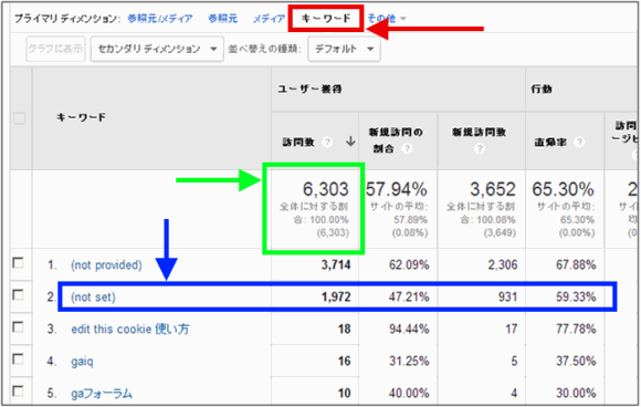 ちなみに、その上の項目「(not provided)」は、検索エンジンから検索キーワードの情報が「提供されなかった」ということを意味している。この2つは似ているが異なるものだ。間違えやすいので、注意しよう。