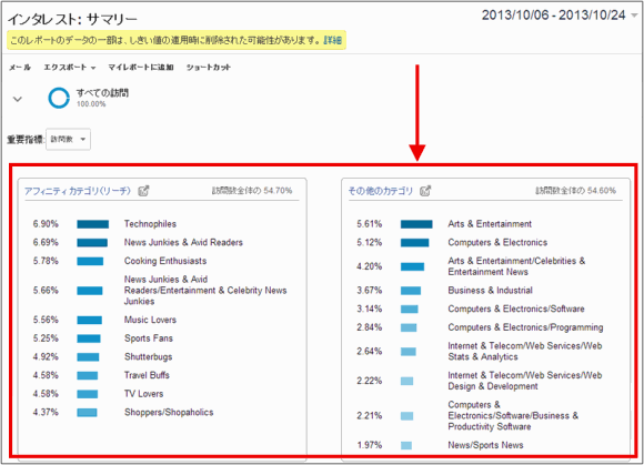 これは[ユーザー]>[ユーザーの分布]>[サマリー]レポート(図3)と同様なレポートで、全体の「アフィニティ カテゴリ」と「その他のカテゴリ」のトップ10(図7赤枠部分)が表示されている。どちらもカテゴリ名が英語表記になっているが、近い将来に日本語化されることを期待したい。