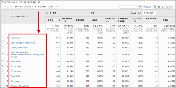 アフィニティ カテゴリ別(図8赤枠部分)に「訪問数」「1訪問あたりのページビュー数」「コンバージョン率」など、「ユーザー獲得」「行動」「コンバージョン」の軸で比較していくことができる。