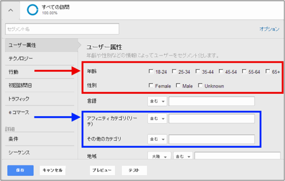 新しいセグメント機能については、次回詳しく解説するが、その新しいセグメント機能では、年齢、性別(図10赤枠部分)や「インタレスト カテゴリ」の項目(図10青枠部分)を指定して、自分用にカスタマイズしたセグメントを作成することも可能だ。