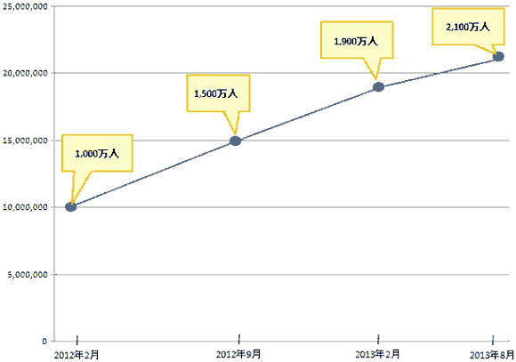 Facebookによる直近の公表は2013年8月で「2100万人突破」としていました。前回(2013年2月)の公表から約200万人の増加となっています。
