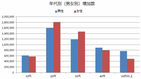 もっとも増えている年代は20代、次いで30代です。従来ユーザー数が多いといわれていた年代が、もっとも増加しています。