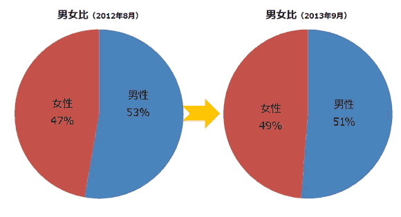 男女比はほぼ半数に、1年前と比べ男女の割合の差が縮まっています。前述のとおり、女性のユーザー増がこちらでもみてとれます。