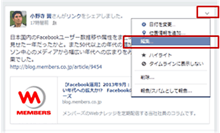 Facebookページへの投稿では、「画像投稿」「リンク投稿」「動画投稿」のテキストは編集できますが、テキストのみの投稿は編集できません。