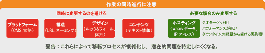 たとえば、新しいドメイン名に切り替える場合は、ドメイン名だけを切り替えるべきで、同時にデザインなど他の何かを変更してはならない。