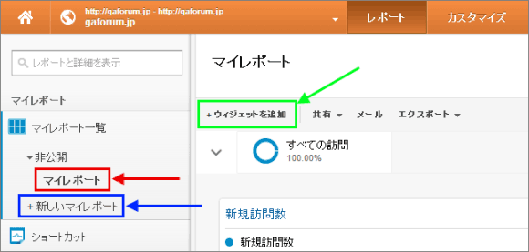 「マイレポート」はいわゆるダッシュボード機能だ。Googleアナリティクスの複数のレポートを1画面に表示して、一目で全体の状況を概観できるようにするレポートである。一見、便利そうな機能ではあるが、じつは筆者はマイレポートを使っていない。