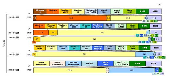 結果としては、Windows XPが27.9%で前回の70%から大幅ダウンしており、Windows 7が55.2%と前回の11.9%から大幅にアップしている。また、最新のWindows 8は1.8%の企業が主要なOSとしていることがわかった。
