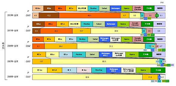 IE 6を主要なブラウザとしている企業を規模別に見ていくと、2011年の前回調査では大企業の割合が高かったが、今回の調査では5,000人以上の規模の会社(11.1%)よりも1,000人から4,999人の規模の会社(19.4%)の割合が高くなっている。この結果から、2014年4月にWindows XPおよびIE 6のサポートが終了するため、大企業ではOSなどの入れ替えが進み、1,000人から4,999人の規模の企業はOSの入れ替えが少し遅れていることが見て取れる。